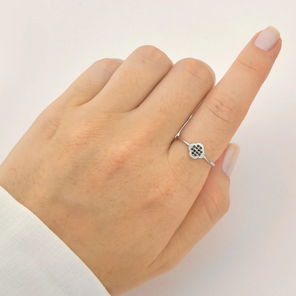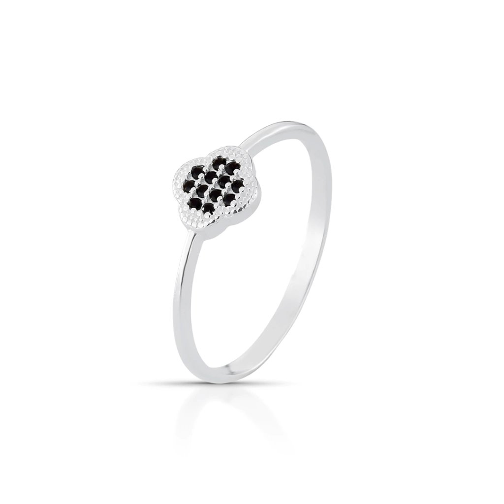 Anel Trevo Cravejado Preto em Prata 925. Delicado, minimalista e elegante, simboliza sorte e proteção. Disponível nos tamanhos 16 e 18, é a escolha perfeita para um charme especial.