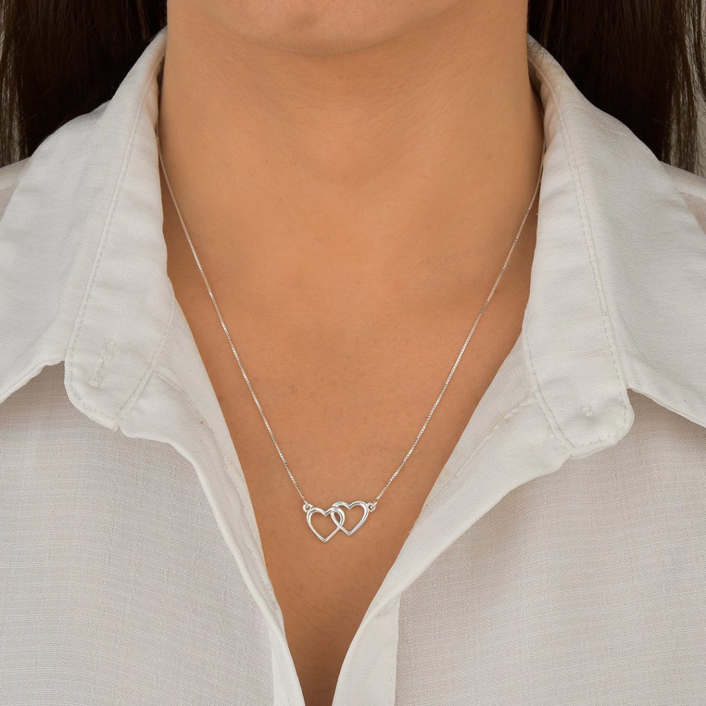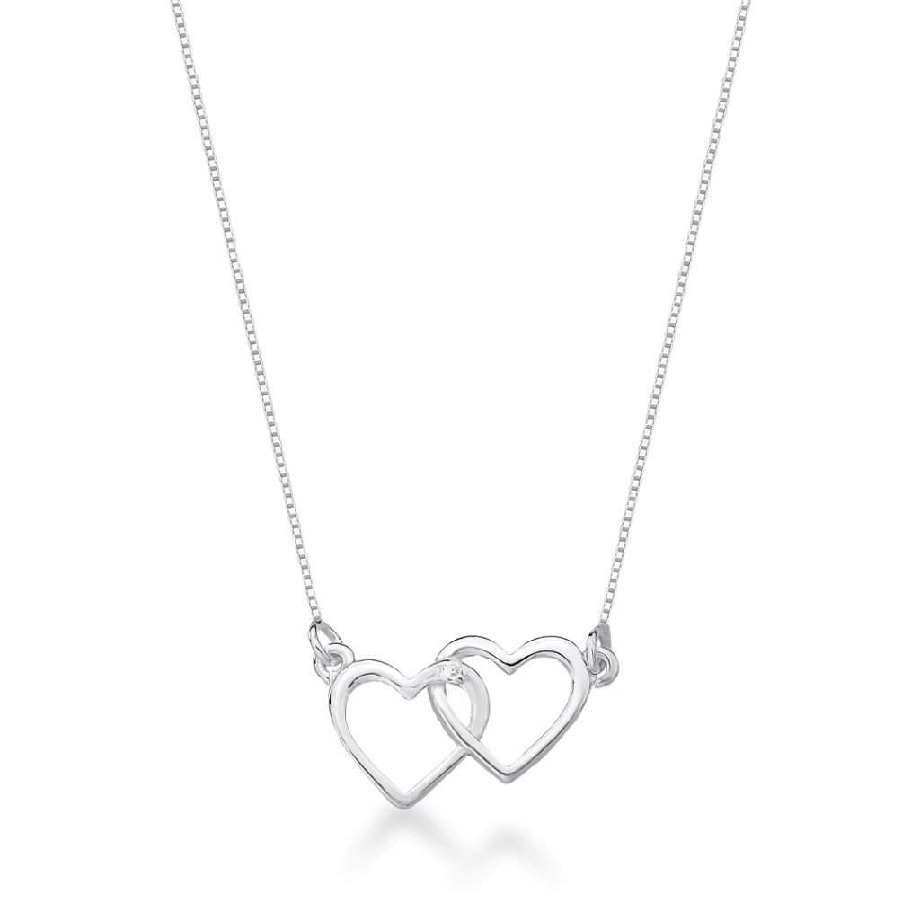 Gargantilha Dois Corações de Prata 925, esse produto usa corrente de prata veneziana, vem com Pingente Dois Corações, que é composto por prata lisa em forma de dois corações interligados;